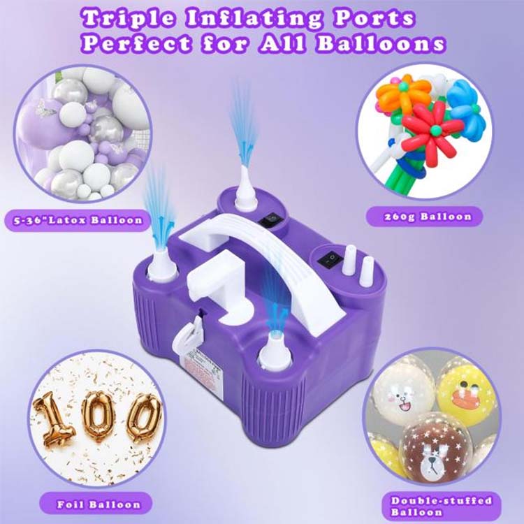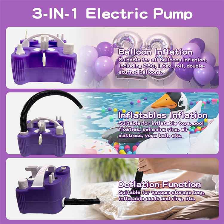Newshine®s nyligen uppgraderade 3 i 1 Electric Balloon Pump har ett trippelprofessionellt ballongmunstyckssystem: 2 runda latexballongmunstycken som passar 5-36 tum standardlatexballonger, vilket gör dem enkla att använda för allt från färgglada ballongväggar vid födelsedagspartier till romantiska ballongkedjor vid bröllop; 1 Utökad professionell ballongmunstycke blåser upp aluminium- och metallfilmballonger, poppande ballonger, dubbelskikts uppblåsbara ballonger och 260Q/360Q magiska ballonger, vilket möjliggör kreativa vändningar och former som djurballonger, blommor och andra DIY-creations. En pump hanterar alla ballongtyper.