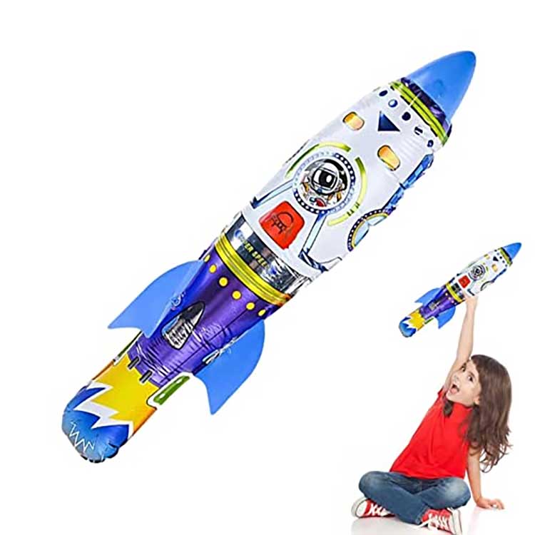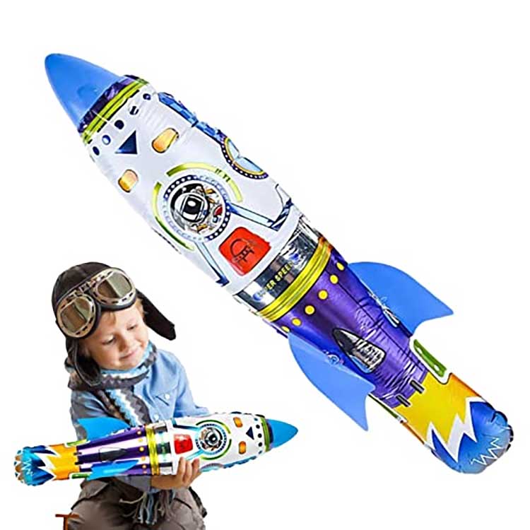 Den uppblåsbara 3D-raketfolieballongen är en lång, oregelbundet formad uppblåsbar leksak med raketrelaterade mönster tryckta på ytan. Huvudet och stjärtfenorna måste monteras för hand och sedan installeras efter att ha blåsts upp. Den är tillverkad av aluminiumfolie, bryts inte sönder och är hållbar för användning i utrymmen och även för lekar och lekar. rekvisita.