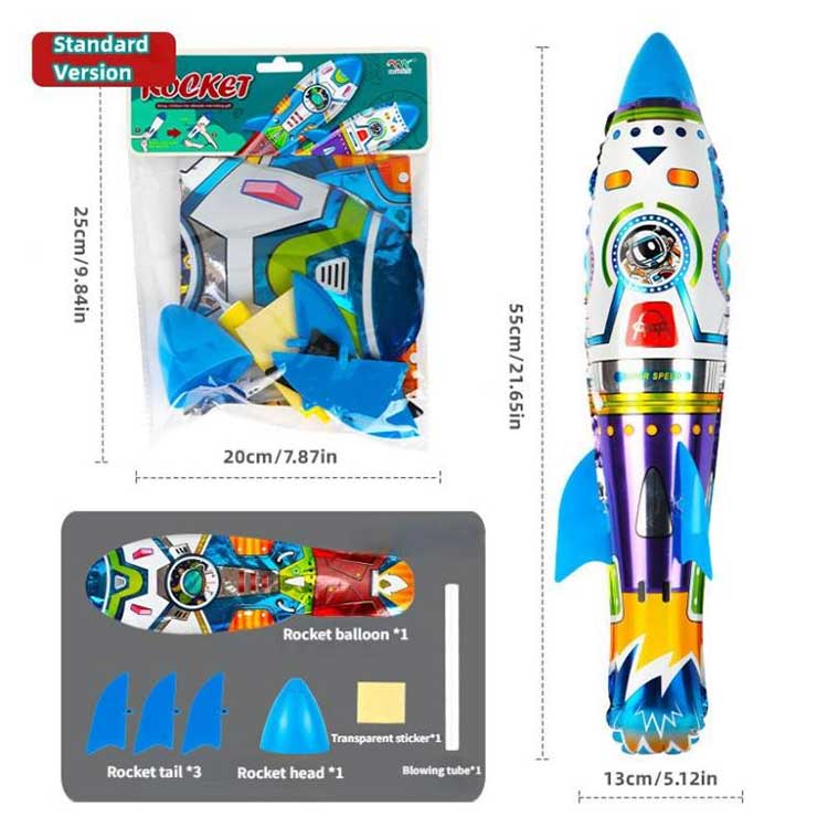 Förpackningen om 3D-raketfolieballong som kastar uppblåsbar är en snygg och välvårdad kartongpåse, som gör att den ser bra ut oavsett om du använder den själv eller ger den i present. Tillbehören inuti är också mycket kompletta: 1 raketballongkropp, 3 raketben, 1 rakethuvud, plus 1 sugrör eller luftpump (ditt val) och 4 klistermärken.
