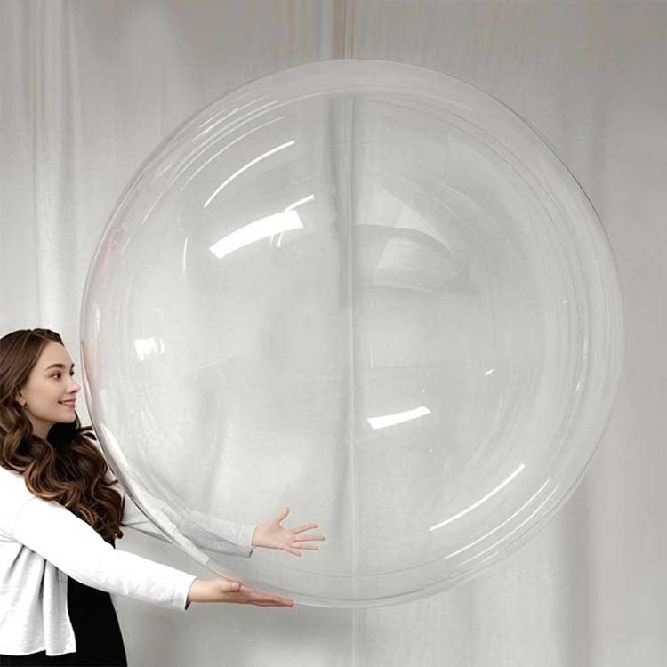 Dessa 48-tums runda klara Bobo-ballonger är gjorda av TPU-material, som erbjuder utmärkt seghet och hållbarhet. Efter uppblåsning är ytspänningen exceptionellt jämn, vilket förhindrar utbuktning och sprängning, och den tål lätt mindre stötar. Denna ballong har ingen plastlukt som finns i vanliga ballonger. Även i slutna utrymmen behöver du inte oroa dig för miljöfrågor. Den transparenta 48-tumsversionen finns i lager och redo att skickas omedelbart. Vi kan också ordna skräddarsydda beställningar på 1000 stycken för andra färger. Dra bara åt tätningen efter uppblåsning; ingen extra tejp behövs. Ballongerna kan behålla sin fulla form i över två månader, vilket minskar underhållskostnaderna under evenemang. Vi testade en bunden ballong i sex månader, och den förblev intakt, ett bevis på dess överlägsna prestanda och göra denna produkt högt ansedd.