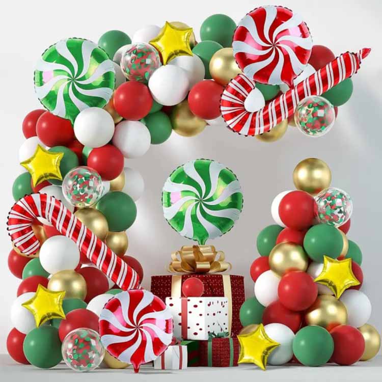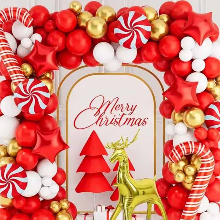 Julballongbågsset är juldekorationsballonger som matchas av våra stylister. De innehåller vanligtvis ballonger av olika material, typer, färger och storlekar. De matchande elementen kan vara aluminiumfolieballonger, latexballonger eller BOBO-ballonger. Och matchande tillbehör som ballongkedjor, limprickar, krokar etc. Den kan användas till inomhus- eller utomhusdekorationer för att hjälpa dig att snabbt skapa en stark julstämning. Lämplig för familjesammankomster, affärsevenemang eller festliga firanden.