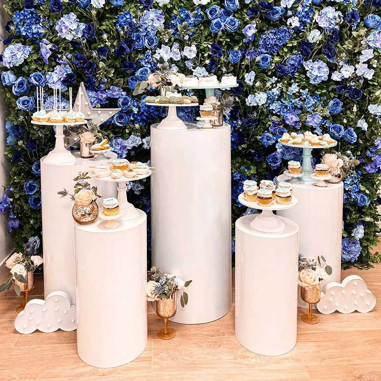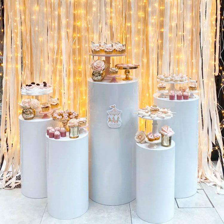 Det cylindriska bottendessertbordet fungerar både som behållare och prydnad. Vanligtvis finns de i olika kombinationer: 3-delade kombinationer, 5-delade kombinationer, 7-delade kombinationer och så vidare. Den vanligaste kombinationen är fem stycken. Oberoende cylindriska rör av olika storlekar kan arrangeras flexibelt, och de är en viktig del av scenen. Samtidigt erbjuder vi även anpassning till storlek och form. Dessutom matchar de dina festdekorationer.