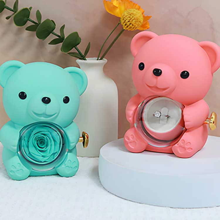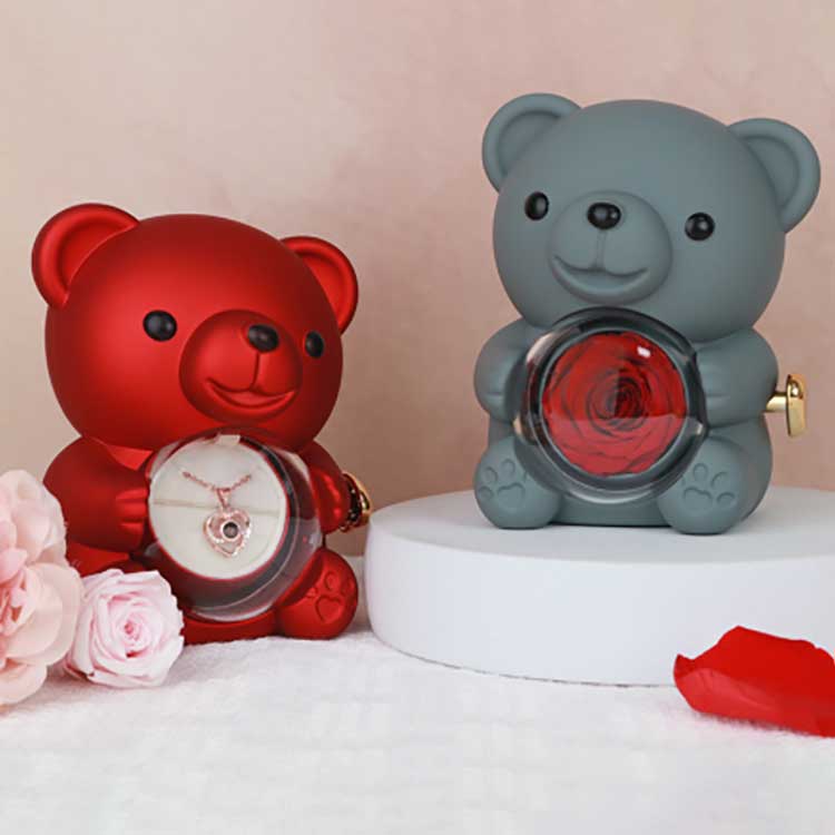 Denna Hug Bear Rose smyckeskrin används för visning på ett skrivbord, bokhylla eller nattduksbord. Dess mest iögonfallande egenskap är den bevarade rosen i mitten. När rosen öppnas avslöjas ett fack för förvaring av smycken, ringar eller minnessaker.
