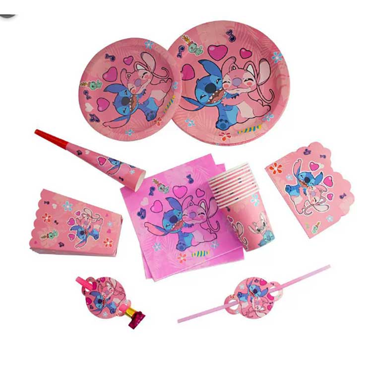 Ett Stitch-set för engångstallrikar innehåller följande produkter: 7-tums tallrikar (10st/påse), 9-tums tallrikar (10st/påse), servetter (20st/påse), vimplar (10st/påse), returpresentpåsar (10st/påse), popcornlådor (6st/påse), blåsande drakar (6 st/påsar), papper/påsar (6st) (10st/påse), horn (6st/påse), sugrör (10st/påse), inbjudningskort (10st/påse), masker (10st/påse), skedar, bestick (10st/påse), och duk (1st/påse). Setet innehåller 17 olika produkttyper. Kunder kan välja att köpa hela setet eller välja bara en del av föremålen för att möta deras behov.